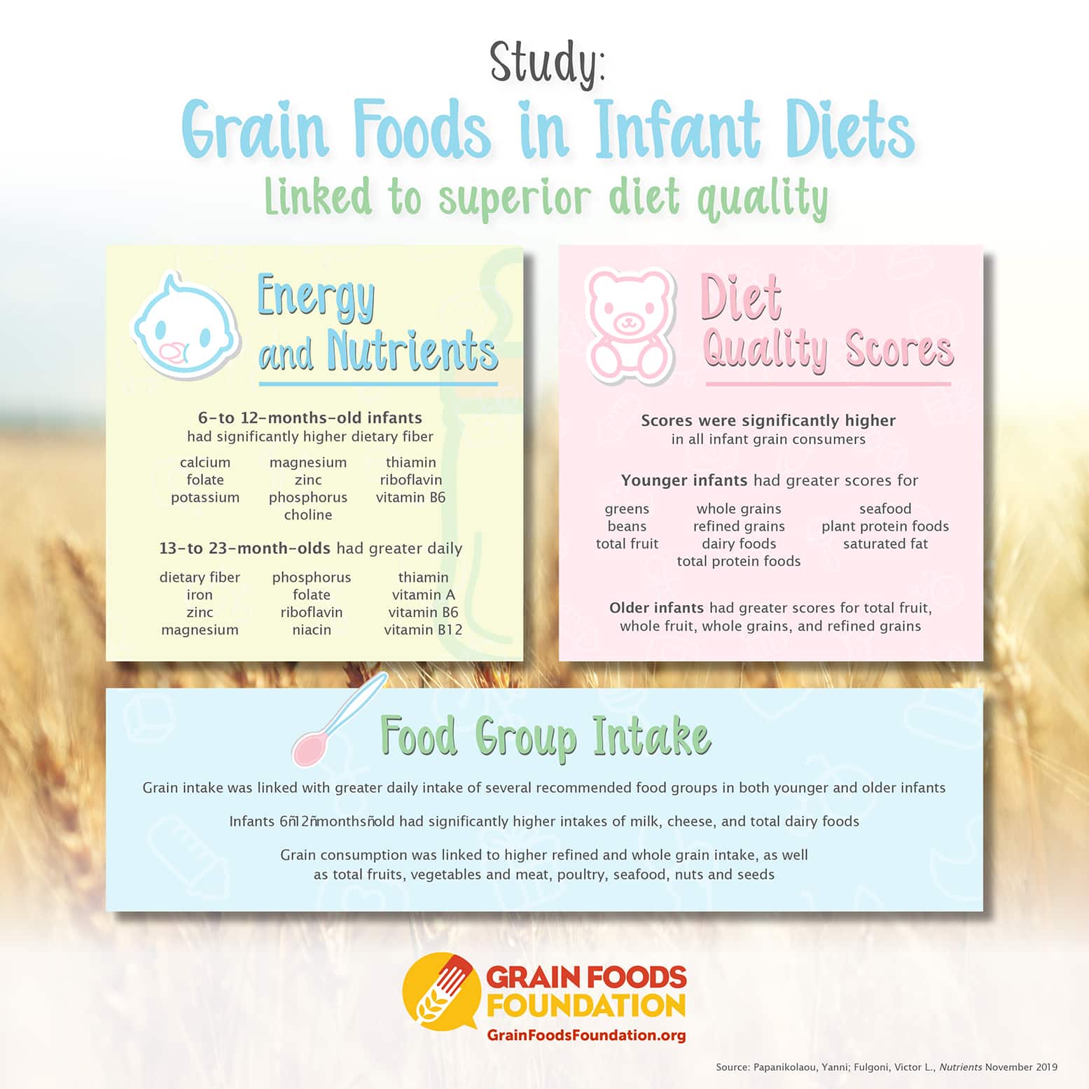Studies have found grain consumption is an important part of a healthy infant diet. Grain consumption can be associated with higher nutrient intakes, better diet quality scores and broader food group intake.
