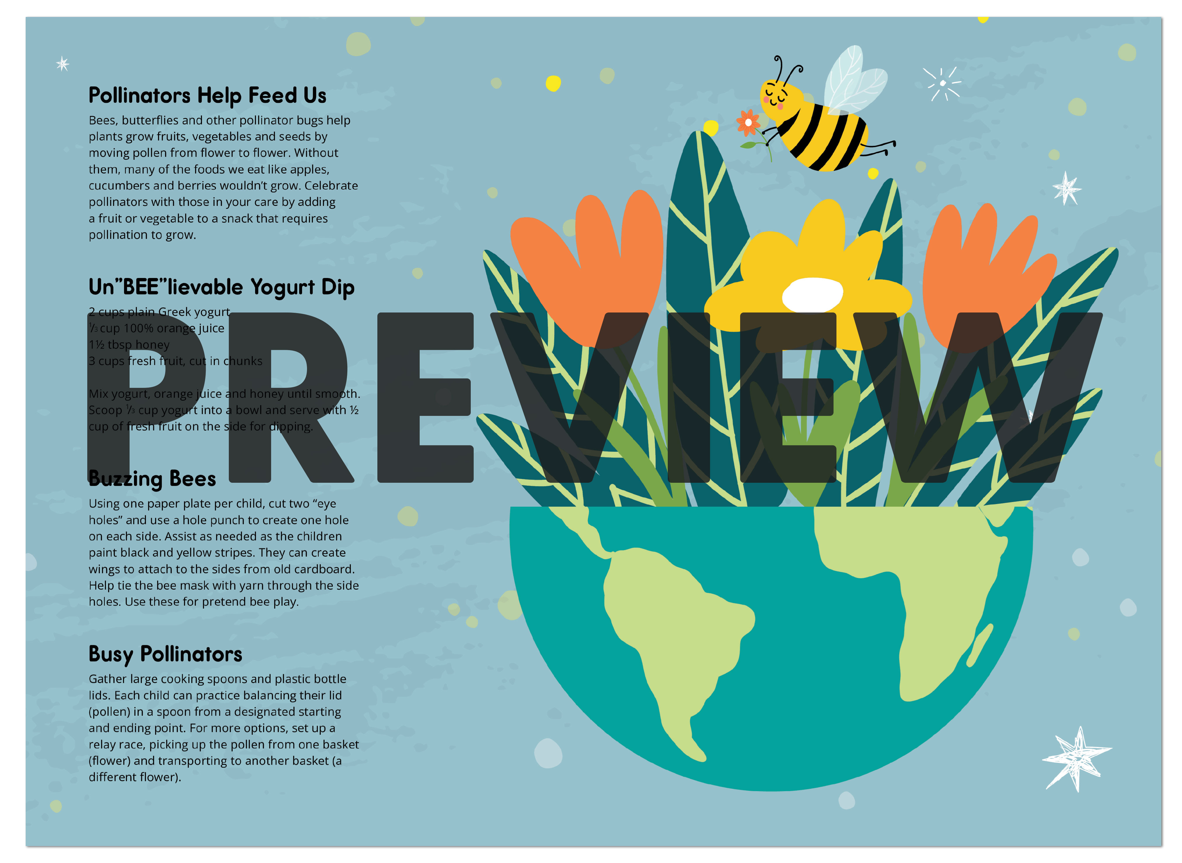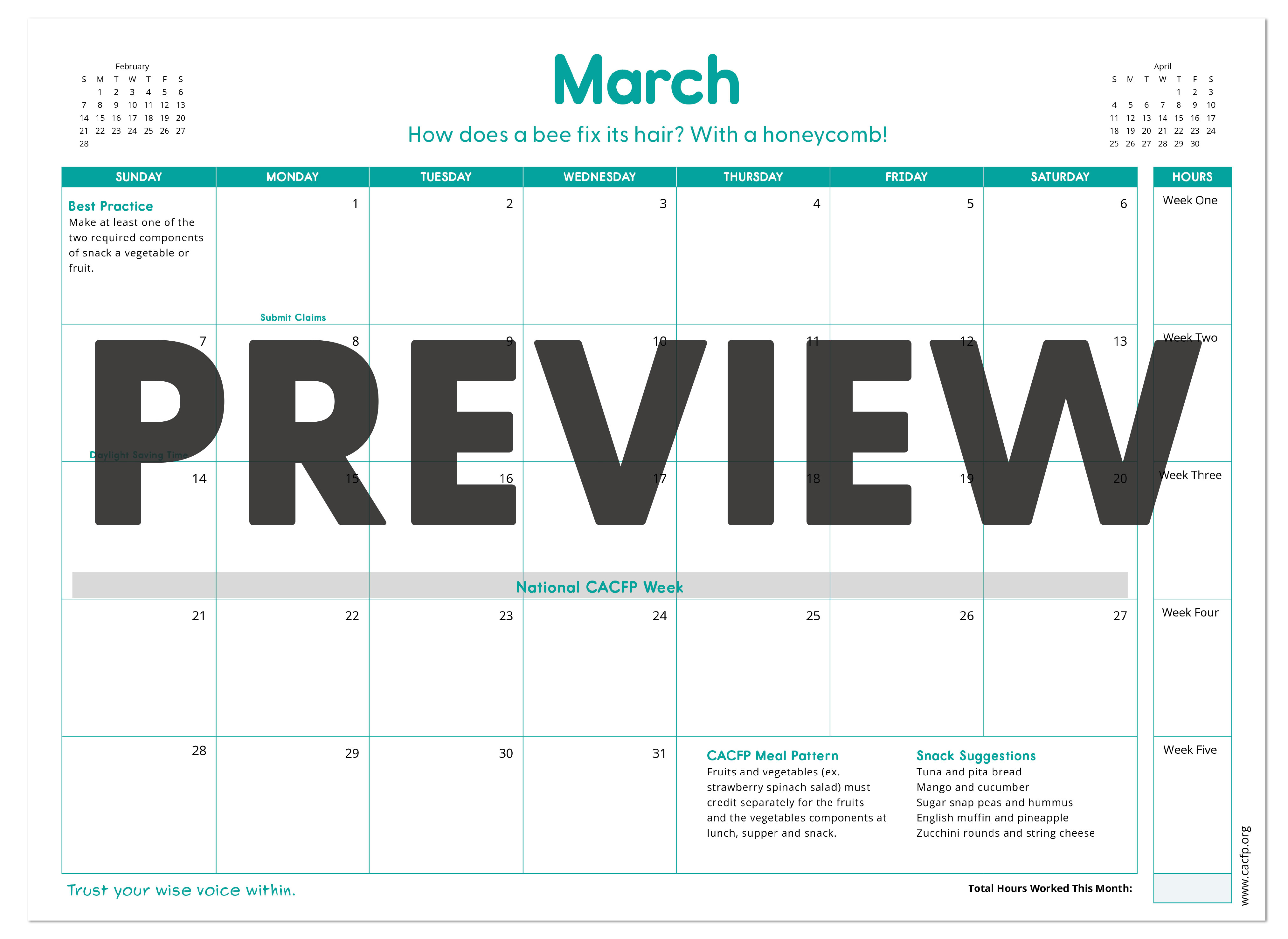 Each month highlights CACFP meal patterns, best practices, snack suggestions as well as healthy recipes, nutrition tips, and table and physical activities. In addition to this valuable nutrition education resource, each month's calendar page has oversized squares for recording important events. The Nutrition Calendar & Record-Keeping System has additional pages each month for business recordkeeping.