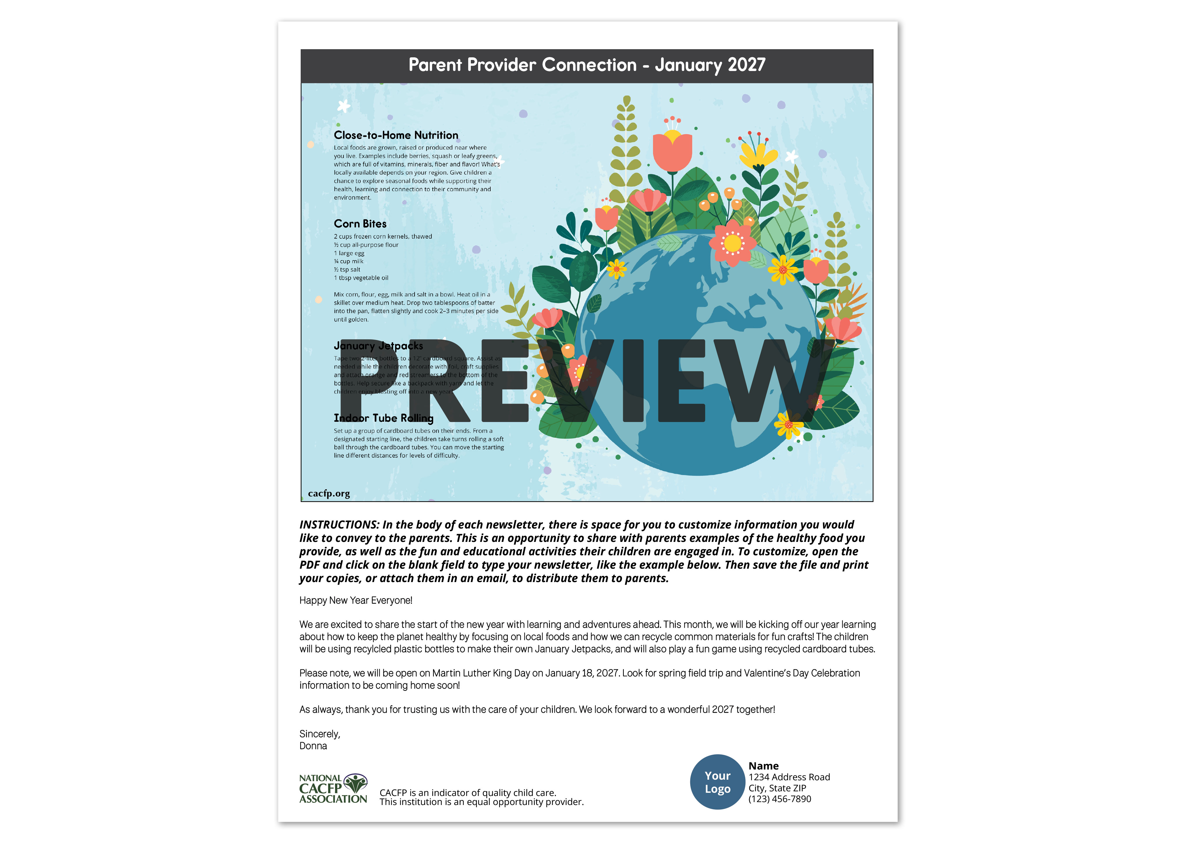 "With a five-hour training module, monthly snacks and recipes, crafts and physical activities, nutrition notes, CACFP Best Practices, motivational moments, parent newsletters, curricula, and record-keeping pages, it's no wonder over 35,000 child care providers across the country consider this their #1 CACFP resource."