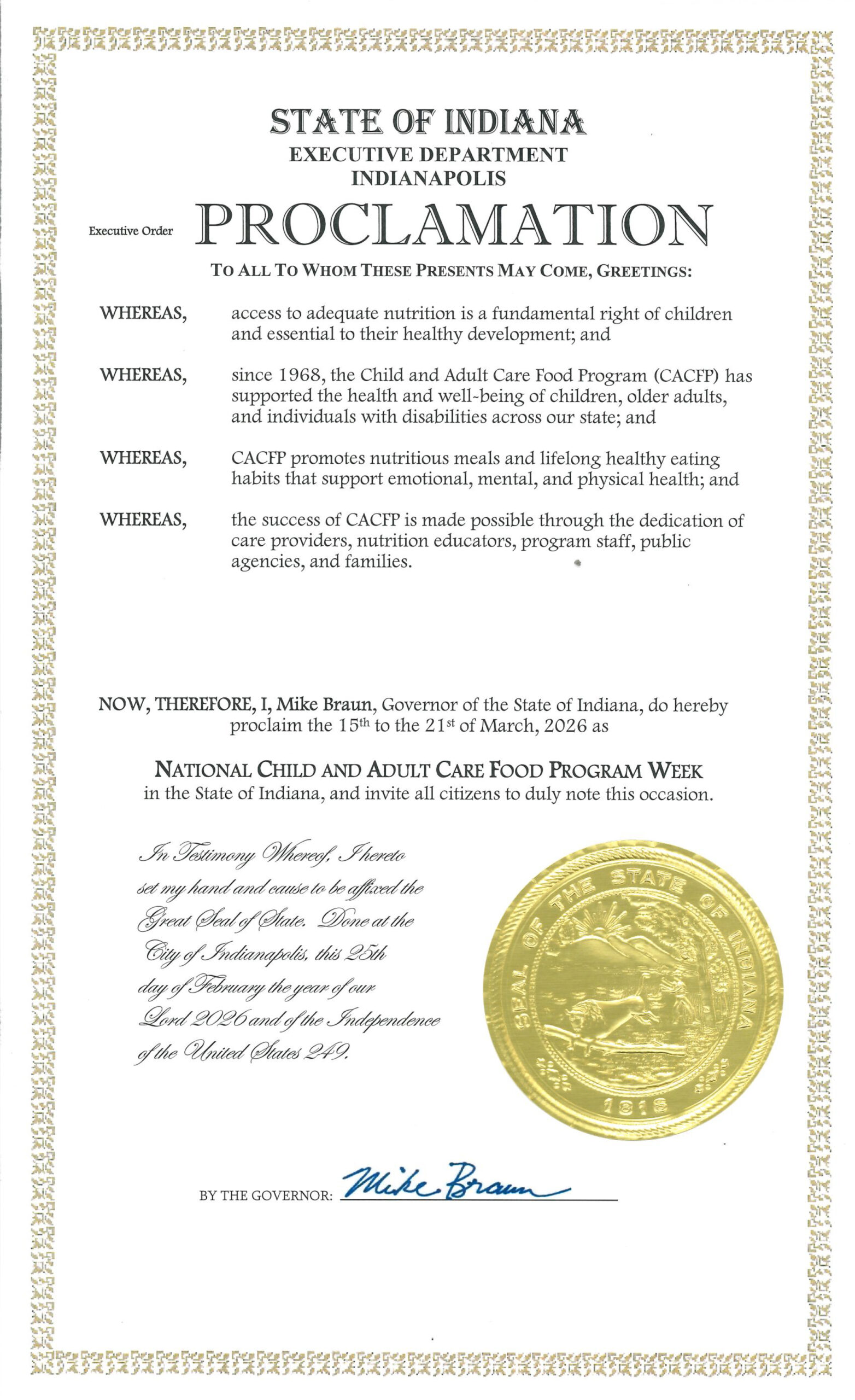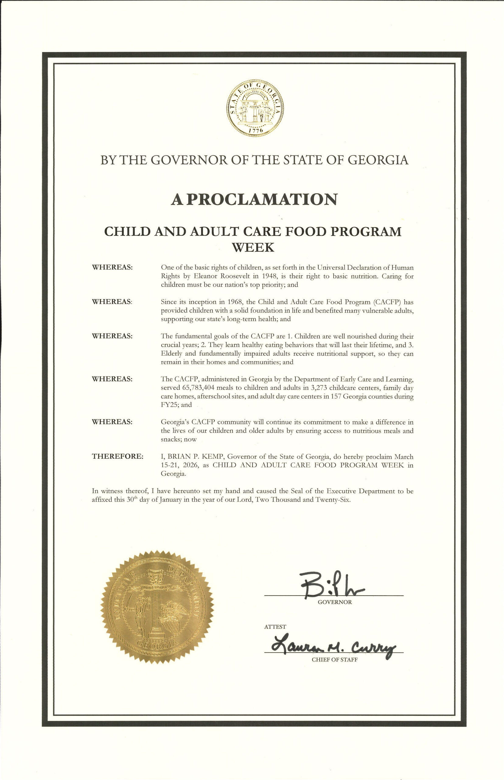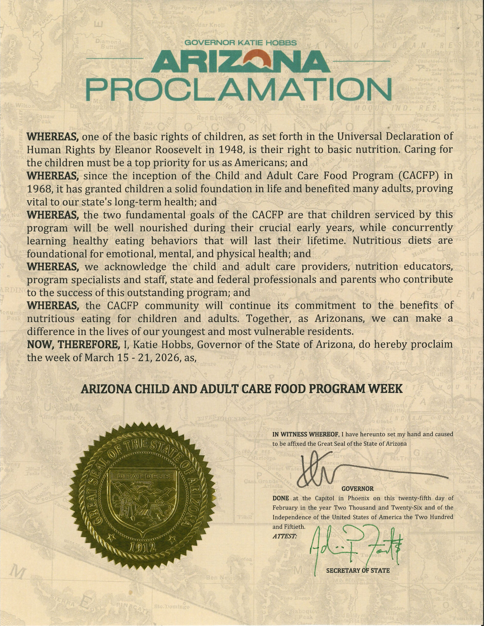 CACFP Week is a national education and information campaign sponsored annually the third week of March by the National CACFP Association. The campaign is designed to raise awareness of how the USDA's Child and Adult Care Food Program works to combat hunger. The CACFP brings healthy foods to tables across the country for children in child care centers, homes, and afterschool programs as well as adults in day care.