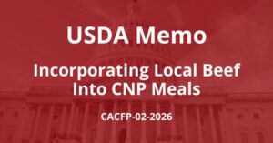 USDA released a memo outlining opportunities within current CACFP and SFSP regulations for operators to procure and use local beef in their creditable meals. The release of the memo is in response to the 2025-2030 DGA recommendation to prioritize protein foods. The memo does not make any changes to current requirements of the CACFP and SFSP; it simply outlines resources to help operators source and serve local beef.